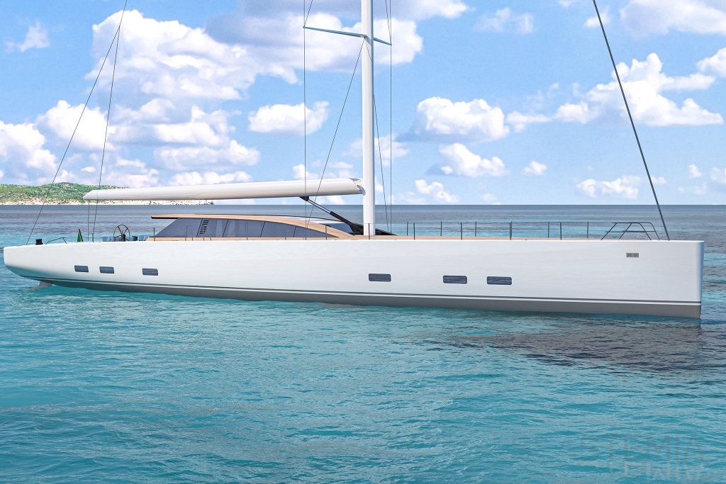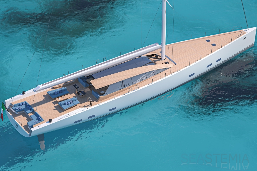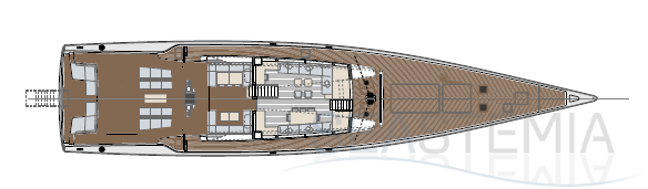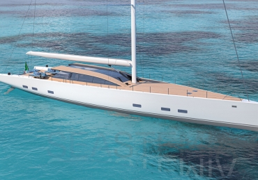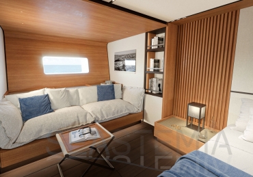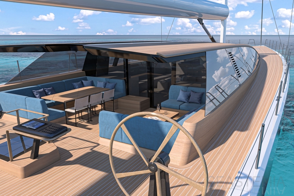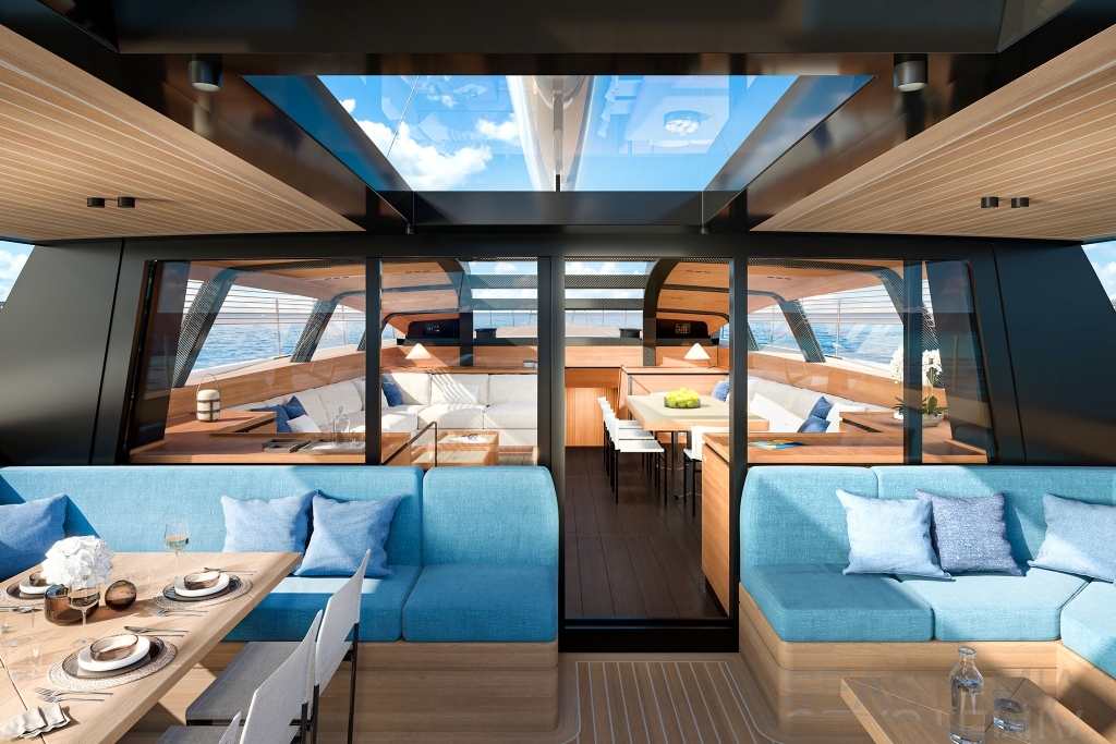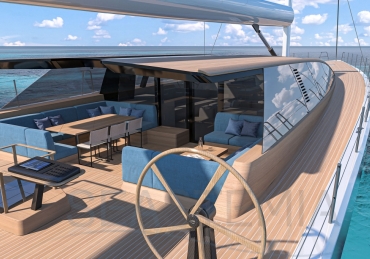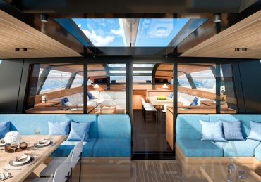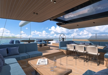 Her full 130ft length makes it possible to introduce a two-level living concept, with the main saloon at deck level and the cabins below. The lightweight carbon deckhouse is glazed on every side, maximising the potential light and dramatic sightlines. The full-length skylight also makes it easy to keep an eye on the sails.