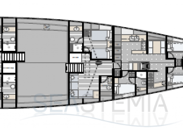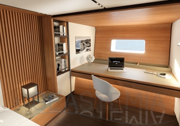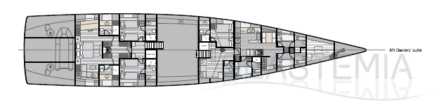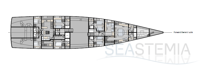 Choose where to put the owner’s suite, with its private salon and his n’ hers bathrooms: forward for ultimate privacy or aft to benefit from the full beam. There are three other guest cabins, all with ensuite bathrooms and storage reminiscent of an even larger yacht.