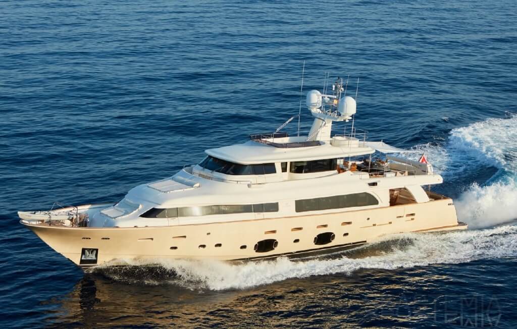 Semi Displacement tri-deck Yacht, she accomodates comfortably 11 guests in 5 cabins, has a 6 crew quarter, and is relatively full on her specification and also on her inventory! With an 18knots top speed, she will cruise comfortably at 13knots to bring you anywhere on the Med Sea with her 700 Nauticcal Miles range.